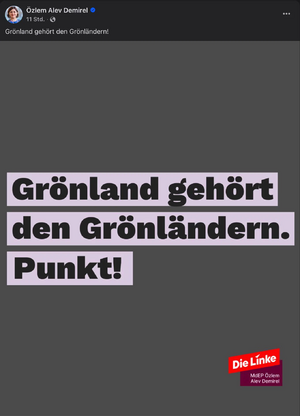 - ↑ "Grönland gehört den Grönländern. Punkt.", sagt die türkischstämmige EU-Abgeordnete der Linkspartei, Özlem Demirel. Stimmt. Und wem gehört Deutschland und wie groß soll linke Doppelmoral eigentlich noch werden, Frau Demirel?, 9gag.com am 7. Januar 2026