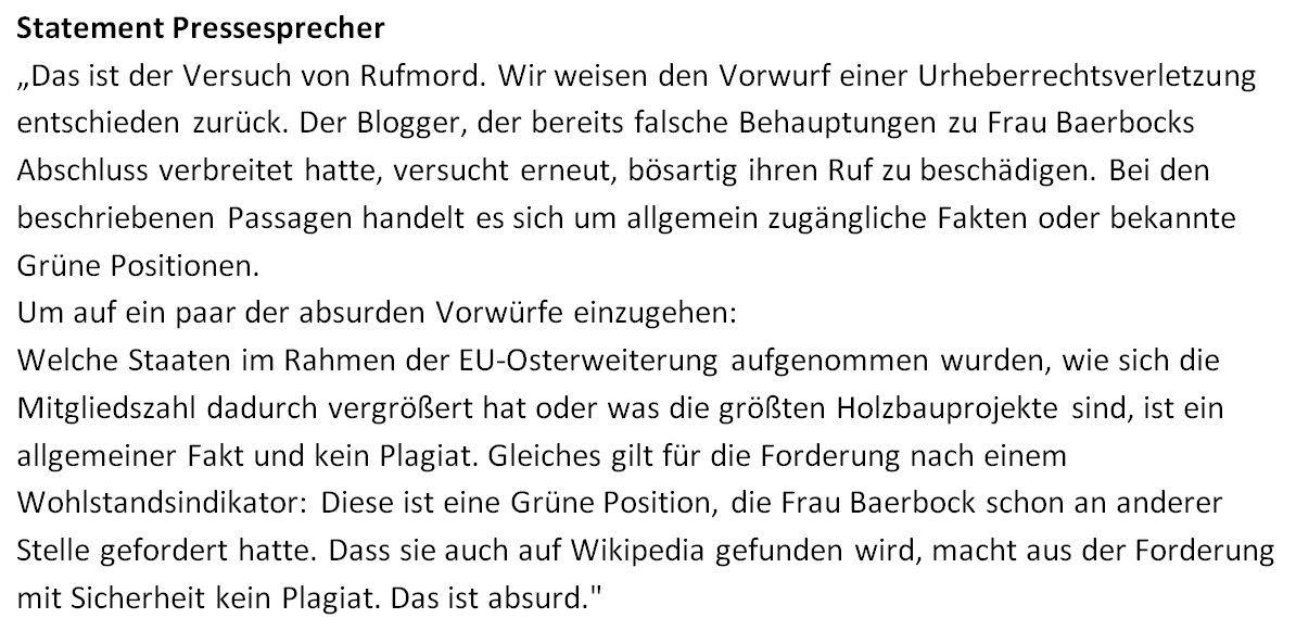 Mal abgesehen davon, dass die Aussagen auch juristisch falsch sind und die da systematisch falsche Rechtsaussagen streuen, denn es ist etwas völlig anderes, ob man "Nachrichten" wiedergibt oder Textpassagen abschreibt, denn letztere sind eben ein Sprachwerk, und damit geschützt, und jemand, der juristisch einen solchen Schwachsinn von sich gibt, besser nicht als Medienrechtsanwalt auftreten sollte. Überlegt mal, wie das grüne Gesindel in den letzten 20, 30 Jahren mit anderen Leuten umgegangen ist. Wie die auf Männer, Weiße, Heterosexuelle, Sachsen, Deutsche eindreschen. Es ist doch wirklich gar nichts zu dreckig, als dass es den Grünen nicht passen würde. Denkt mal an den ganzen Genderkrampf. Wie die da reihenweise Leute abgesägt und vernichtet habe, obwohl die wirklich gar nichts falsch gemacht hatten. Oder wie die mit Polizisten umgehen. Oder mit Leuten, die poltisch eine andere Meinung auch nur äußern. Und diese Charakterjauchegrube regt sich nun darüber auf, dass man Lebenslauf und Buch Baerbocks überprüft, bevor man diese Nullnummer zur Kanzlerin macht. Wer wählt solche Leute? Wer will eine solche Herangehensweise als Bundesregierung haben? | ||